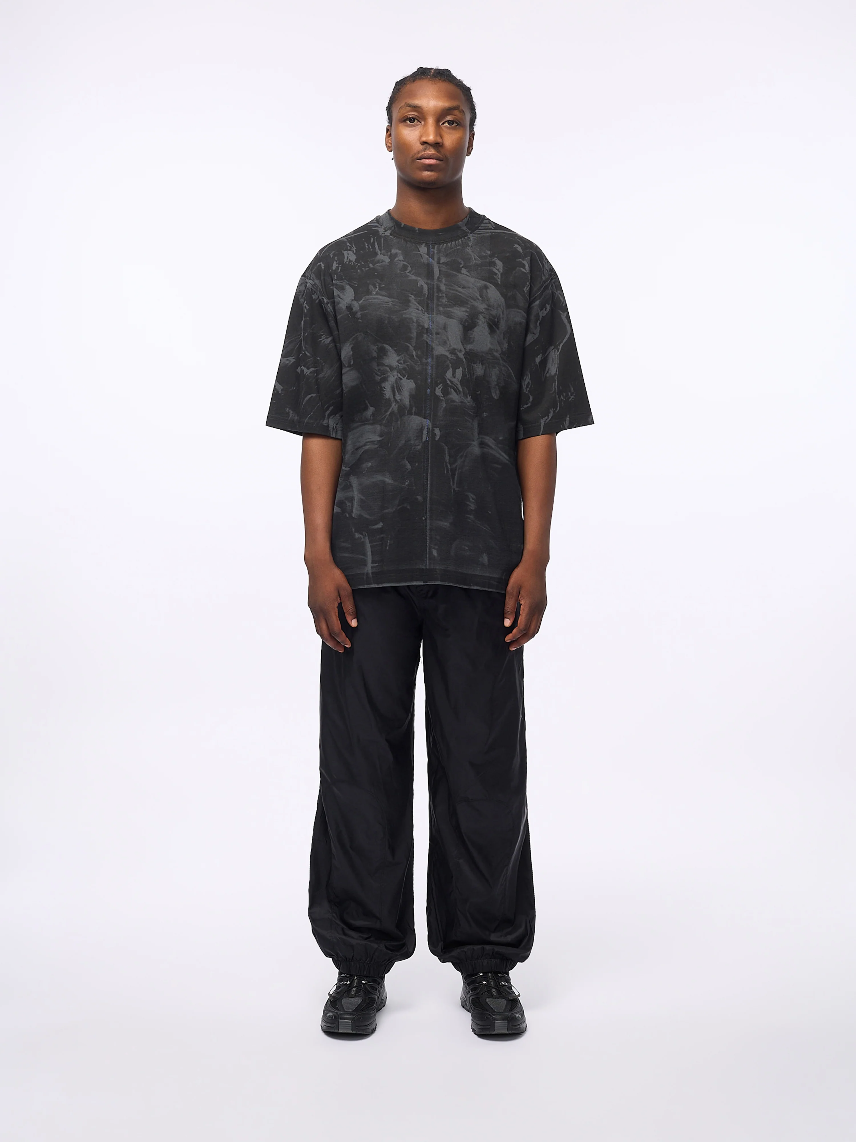 Relaxed-fit cotton T-shirt featuring a seasonal full-body screen print applied directly to it the garment. Constructed with a overseam cut and sew front seam.