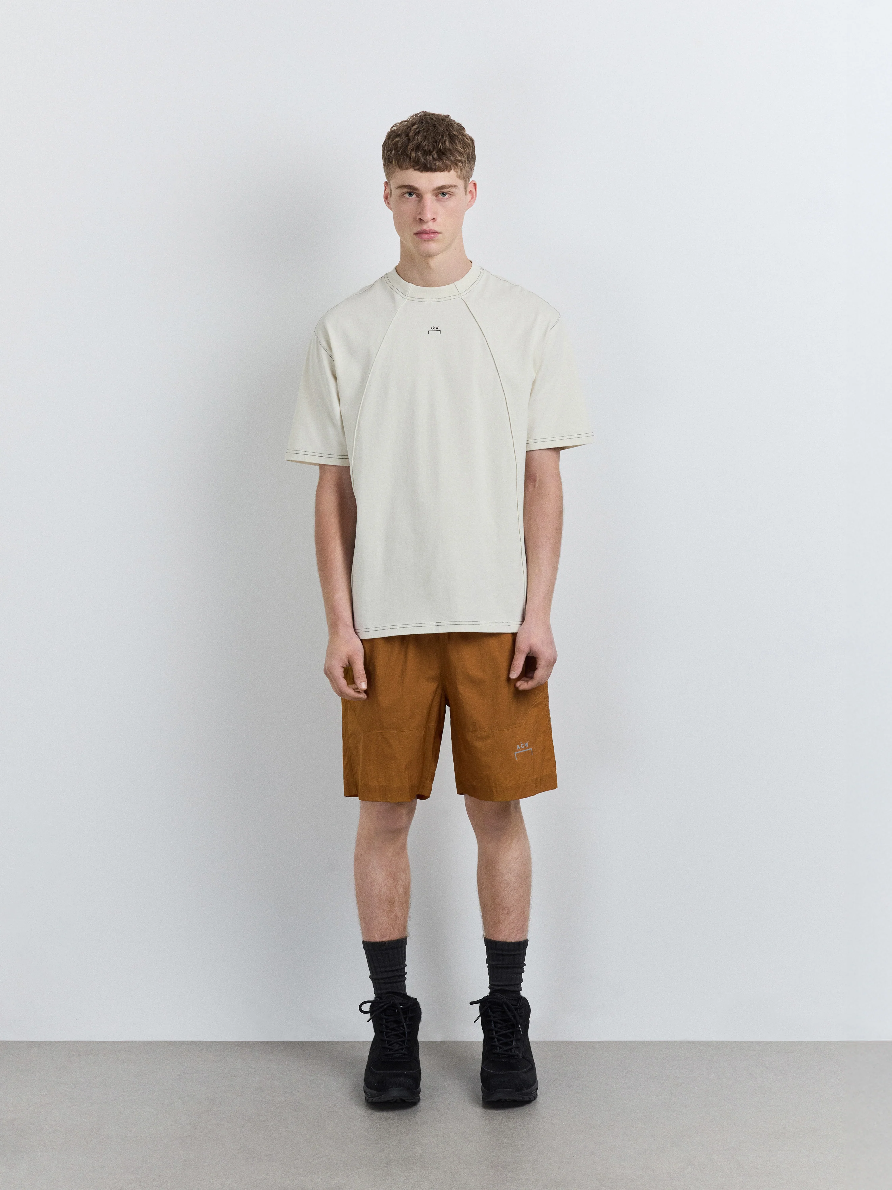 Relaxed-fit cotton T-shirt with piped seams bisecting the front. Contrast colour stitching runs on hem, neck and sleeve. Reilly is 6'2 and is wearing size M.