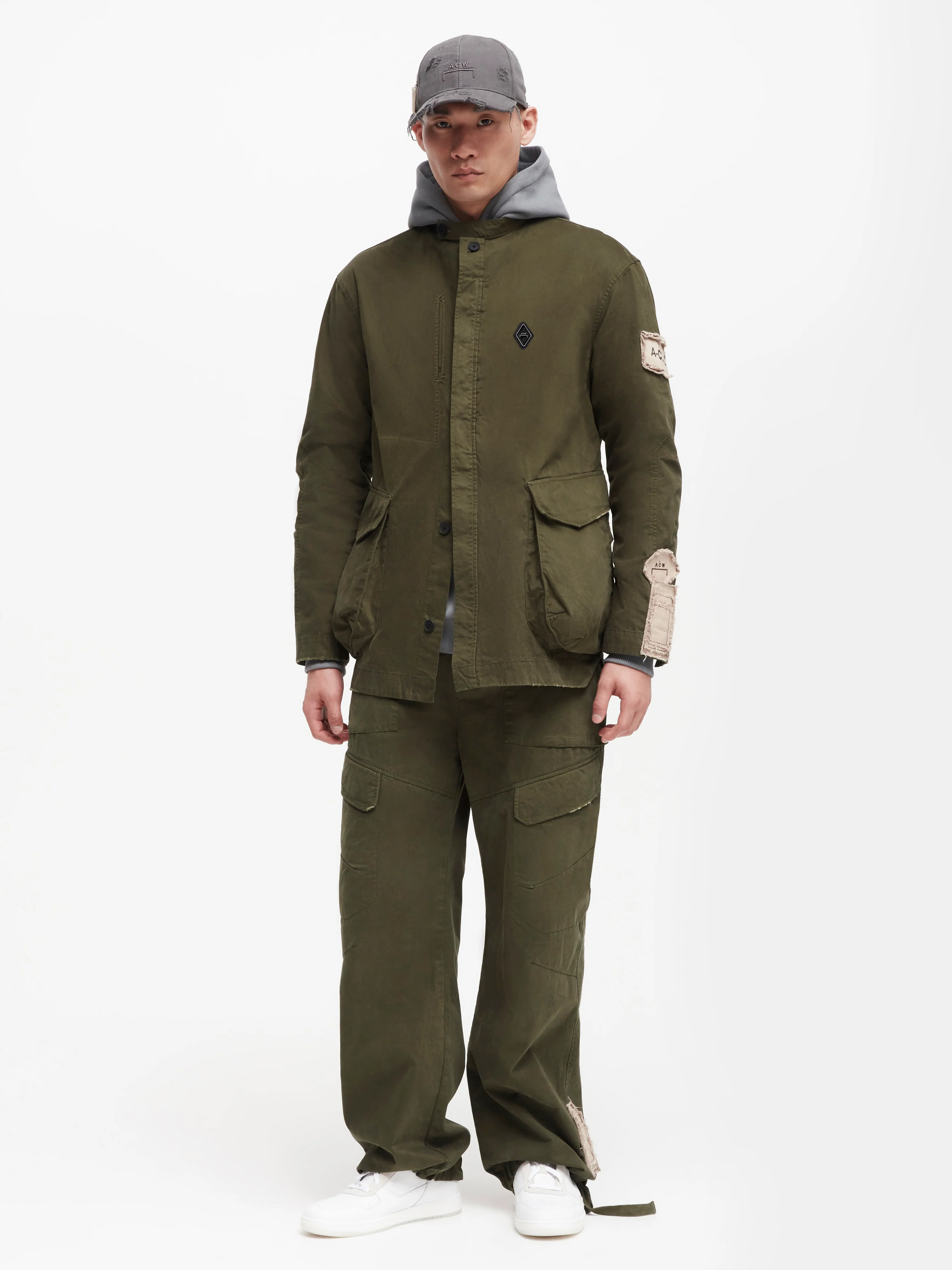 A versatile overshirt designed to work across seasons, distressed detail elevates the piece from a raw edge finish stand collar to the collection's trademark vintage patches, asymmetric seams and angled hems draw attention to shaping and silhouette.