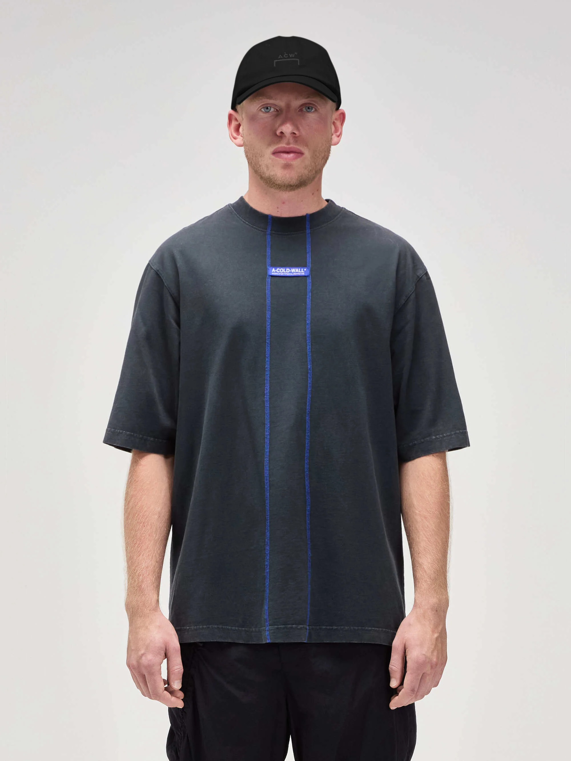 A five-panel baseball cap in pure cotton twill. Split detailing to all seams, and bound finish at hem and peak. Carries an embroidered bracket logo.