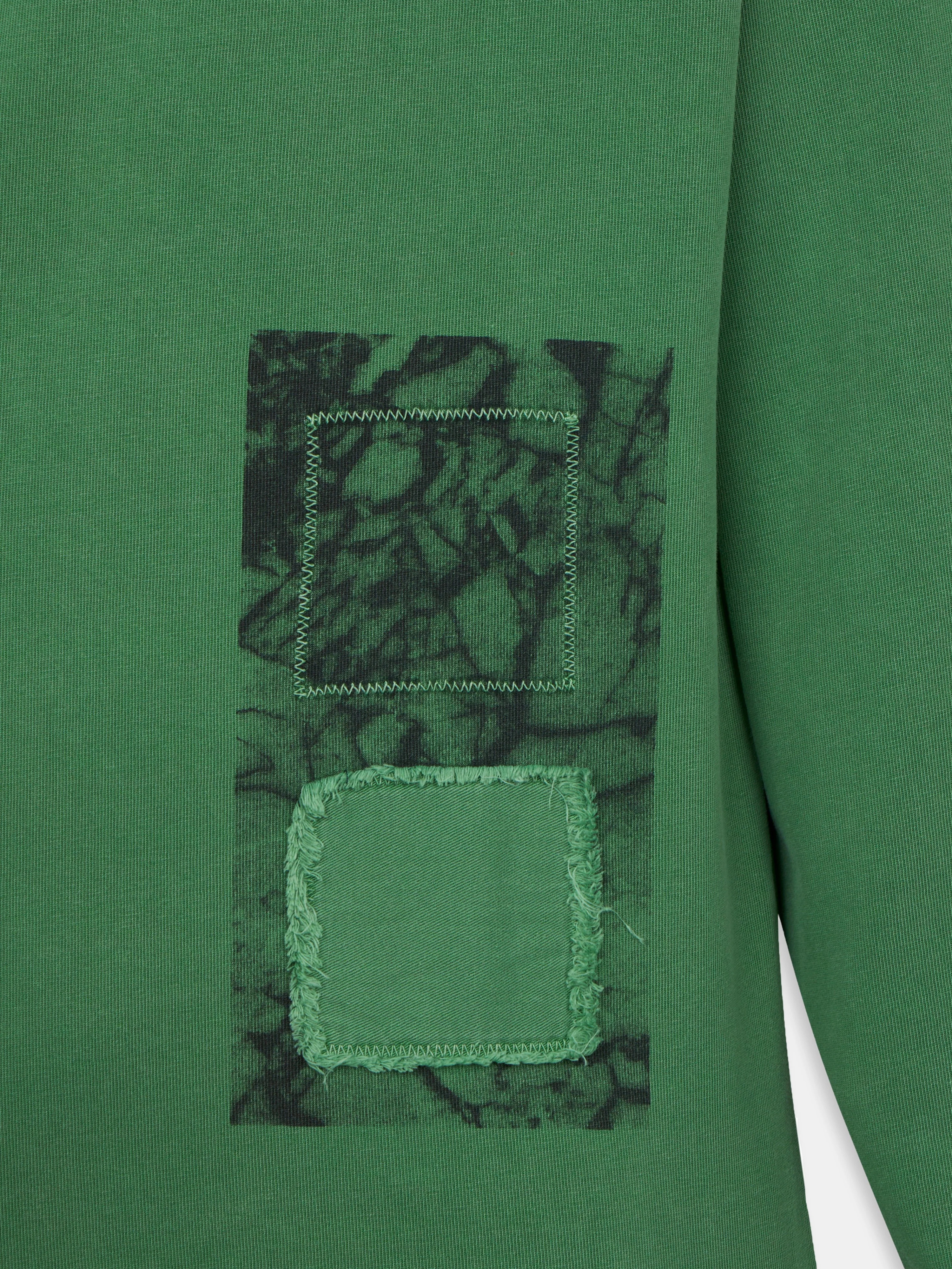 Heavyweight cotton transformed into a regular fit long-sleeve t-shirt. An off-centre application defines the garment, a marbled screen print with applied fabric patches and ACW* logo installing layers of texture and pattern.